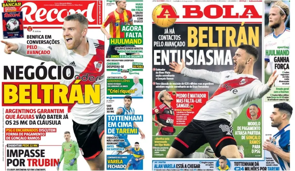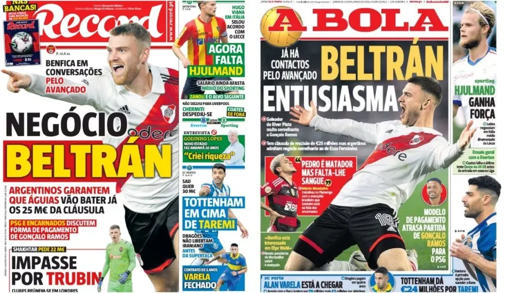 Por dichas causas la imagen del goleador de River apareció este sábado en las principales tapas de los diarios deportivos más prestigiosos portugueses, donde lo ponen como posibilidad firme para arribar allí los próximos días. “Beltrán entusiasma mucho a Benfica. Ya hay contactos avanzados. El goleador de River Plate es muy semejante futbolísticamente a Gonçalo Ramos (delantero a punto de ser vendido por los portugueses) y desde Argentina admiten que se puede dar una negociación parecida a la de Enzo Fernández”, titula la portada del diario “A Bola”.