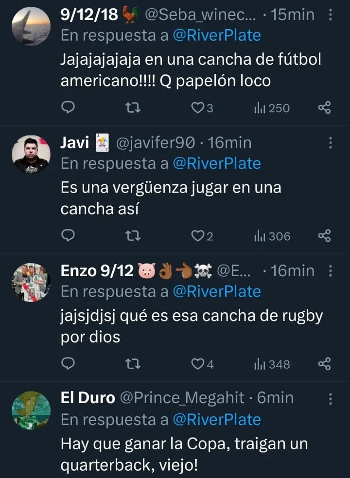 Las primeras imagenes, en la previa del partido, mostraron un panorama por demás llamativo: el campo de juego estaba puntada con líneas, números y hasta publicidades que forman parte de otro deporte, el fútbol americano. Ya desde la entrada en calor se notaron también algunas imperfecciones.