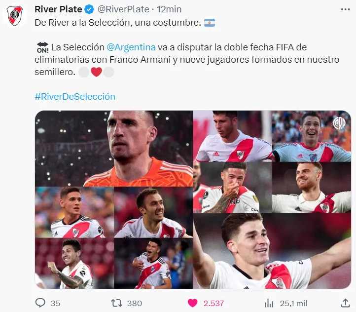 El fiel reflejo del enorme trabajo que se hace en el fútbol formativo de River es lo que sucede en la Selección Argentina. La mayoría de los campeones del mundo en Qatar 2022 se formaron en el Más Grande. Lionel Scaloni dio a conocer la nómina de convocados para la tercera y cuarta fecha de las Eliminatorias Sudamericanas en las que Argentina se medirá ante Paraguay en el Monumental y contra Perú en Lima y en la misma se destaca la presencia de Franco Armani y de nueve jugadores formados en el Millonario.