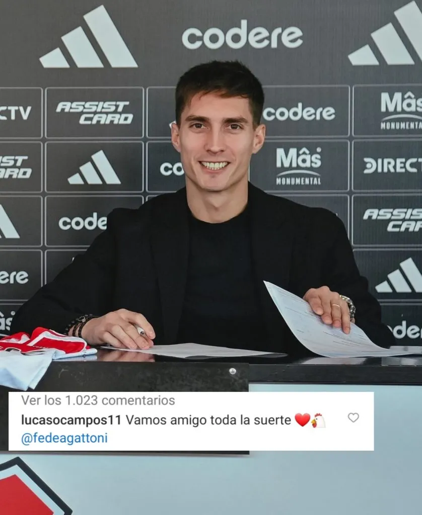 Se trata de Lucas Ocampos, quien compartió plantel con Gattoni en el Sevilla y quien además aprovechó una publicación de River presentando al jugador para manifestarle sus mejores deseos. “Vamos amigo toda la suerte”, expresó el mediocampista ofensivo que hace más de una década se encuentra en Europa, y además agregó un corazón y un emoji de una gallina en referencia al club donde debutó en Primera División a mediados del 2011.