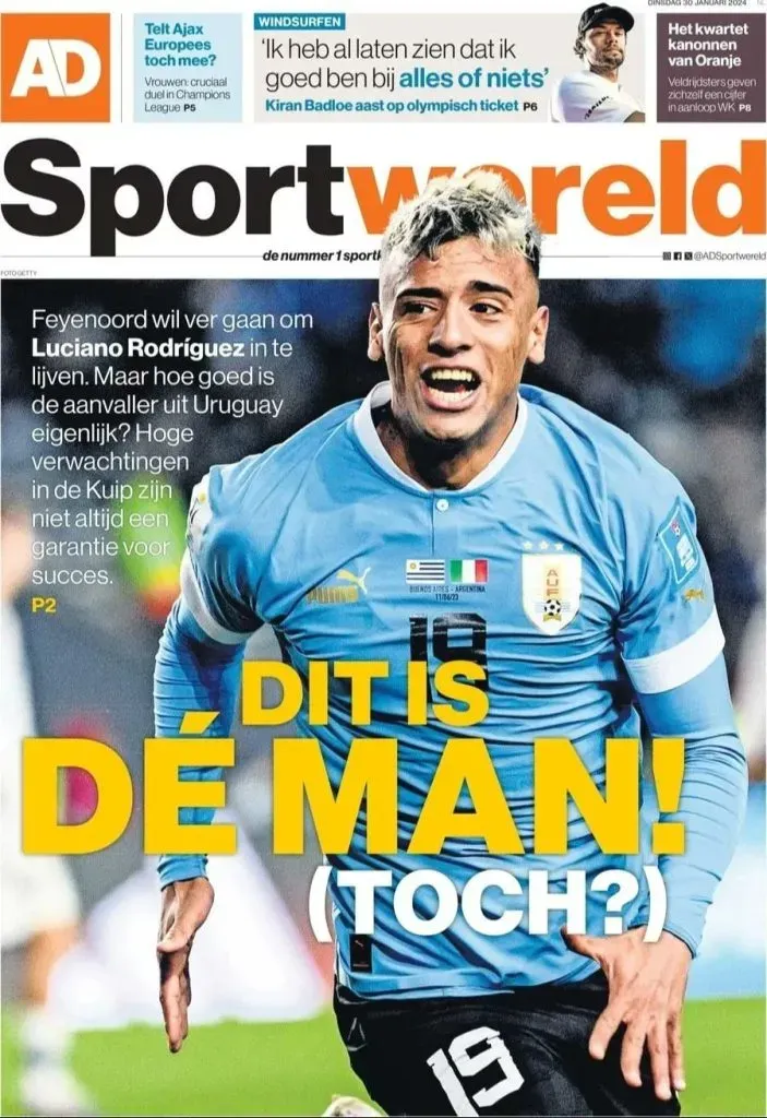 Así lo indican algunos principales portales y medios de Países Bajos, quienes ubican a Rodríguez como muy cerca de sumarse a las filas del Feyenoord. “Éste es el hombre!”, tituló el diario deportivo “Sportworeld” en la jornada de este martes, donde aseguran que el equipo ubicado en la ciudad de Róterdam tiene todo encaminado y avanzado para sumarlo cuando termine su participación en el Preolímpico, donde es la gran fugura de la selección uruguaya.