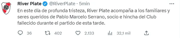 “El Comité de Seguridad en el Fútbol y el Club Atlético River Plate lamentan informar que, en el partido de esta tarde ante Defensa y Justicia, un simpatizante saltó al vacío desde la tribuna Sívori Alta y falleció en el acto. El servicio médico llegó al instante al sector del incidente, al igual que la policía y los distintos organismos de seguridad.