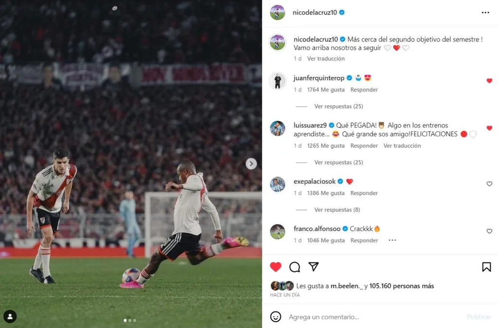 Nicolás De La Cruz y Luis Suárez son compañeros en la Selección de Uruguay y tiene muy buena onda, pese a ser de dos generaciones distintas. El atacante de Gremio de Porto Alegre le comentó una foto en Instagram a De La Cruz en la que se lo veía en el momento previo de su extraordinaria ejecución. El ex Barcelona escribió: “Que pegada! Algo en los entrenos aprendiste. Que grande sos amigo! Felicitaciones”.