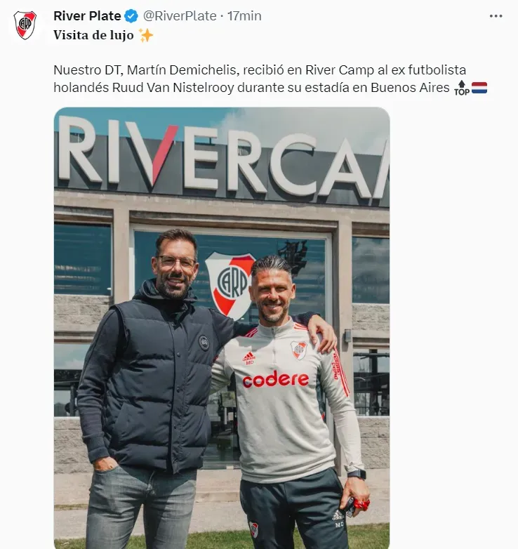 Luego de ver con sus propios ojos la gran victoria de River en la Bombonera, van Nistelrooy visitó a Martín Demichelis en el predio del Más Grande en Ezeiza. Cabe recordar que Micho y el enorme ex delantero holandés fueron compañeros en Málaga entre 2011 y 2012, cuando van Nistelrooy disputó su última temporada como futbolista profesional. El holandés tuvo la oportunidad de recorrer el River Camp, uno de los mejores predios deportivos de Sudamérica que nada tiene que envidiarles a muchos de Europa.
