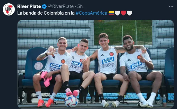 El equipo cafetero, conducido por Néstor Lorenzo, se prepara para su debut el próximo lunes por la noche ante Paraguay por el Grupo D. En la previa, Borja se mostró muy cercano a los tres ex River en los entrenamientos. De hecho, hubo foto de los cuatro que se volvió viral entre los fanáticos del Millonario.