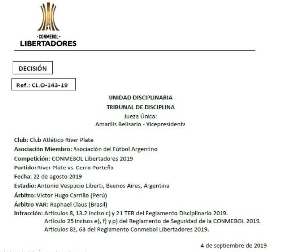 La Unidad Disciplinaria de la Conmebol le aplicó una multa y advertencia a River como consecuencia del uso de bengalas en el estadio Monumental. Los elementos pirotécnicos están terminantemente prohibidos por el máximo organismo del fútbol sudamericano e incluso es un hecho que Cerro Porteño también recibirá una fuerte sanción a raíz del excesivo volumen empleado el jueves pasado en La Olla.