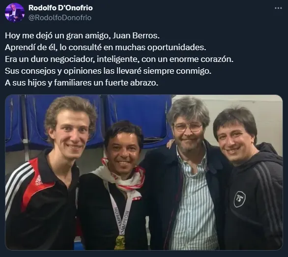 “Hoy me dejó un gran amigo, Juan Berros. Aprendí de él, lo consulté en muchas oportunidades. Era un duro negociador, inteligente, con un enorme corazón. Sus consejos y opiniones las llevaré siempre conmigo. A sus hijos y familiares un fuerte abrazo“, escribió el ex presidente de River en Twitter.