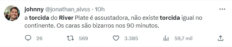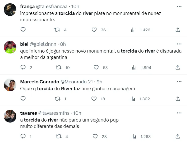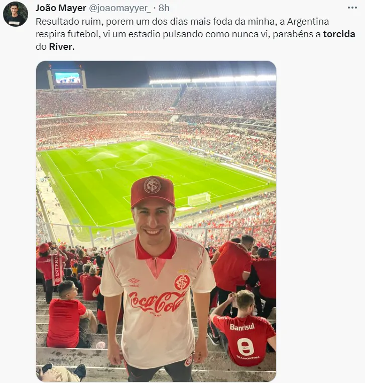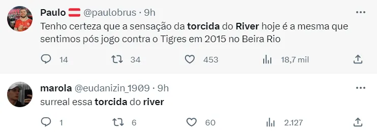 En las redes sociales se llenaron de mensajes de hinchas de Inter que elogiaron a la hincha del Millonario, hubo incluso hinchas que tuitearon desde el Monumental. El usuario @joaomayyer_ estuvo en el Centenario Alta alentando a Inter y escribió: “Argentina respira fútbol, vi un estadio alentando como nunca vi. Felicitaciones a toda la hincha de River”. Otros afirmaron que la hinchada de River asusta y que nunca habían visto algo así. También compararon el clima del pasado martes con la final de la Libertadores de 2015 ante Tigres.