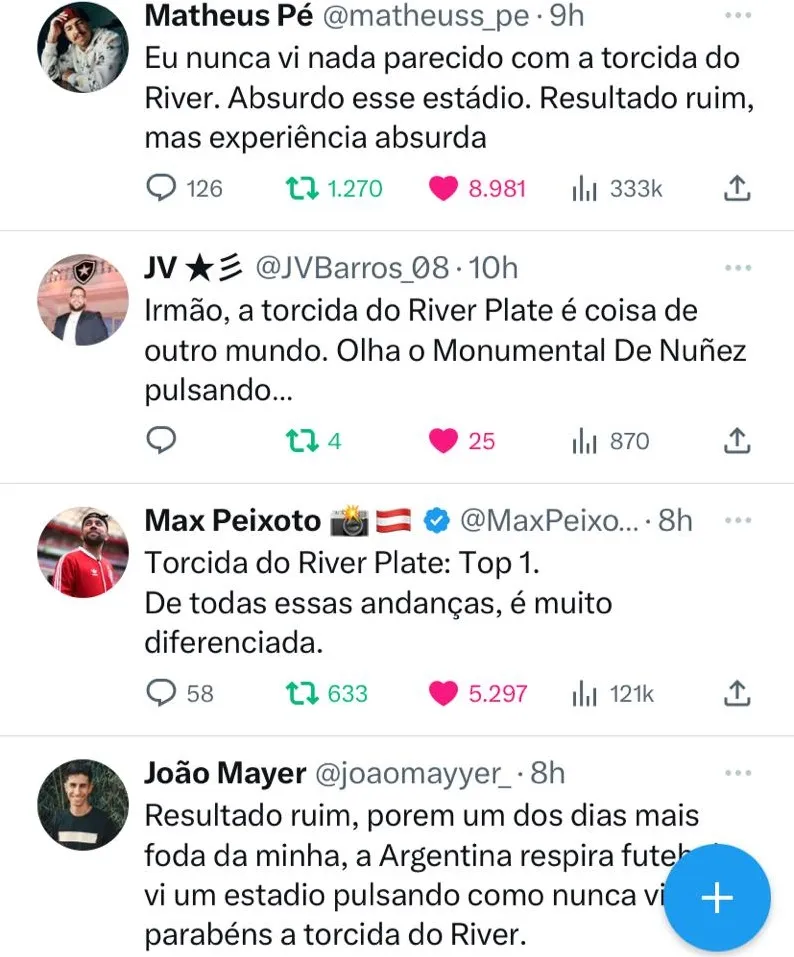 Ya contra Fluminense -un partido prácticamente de vida o muerte, deportivamente hablando- se había visto una hinchada eufórica. Los cuatros costados del Monumental unidos con el mismo objetivo: amedrentar al rival y apoyar a los propios y en ambos partidos el resultado terminó siendo favorable para el equipo de Martín Demichelis y tras el partido, las redes sociales se llenaron de elogios a los “torcedores” -como llaman los brasileños- riverplatenses.