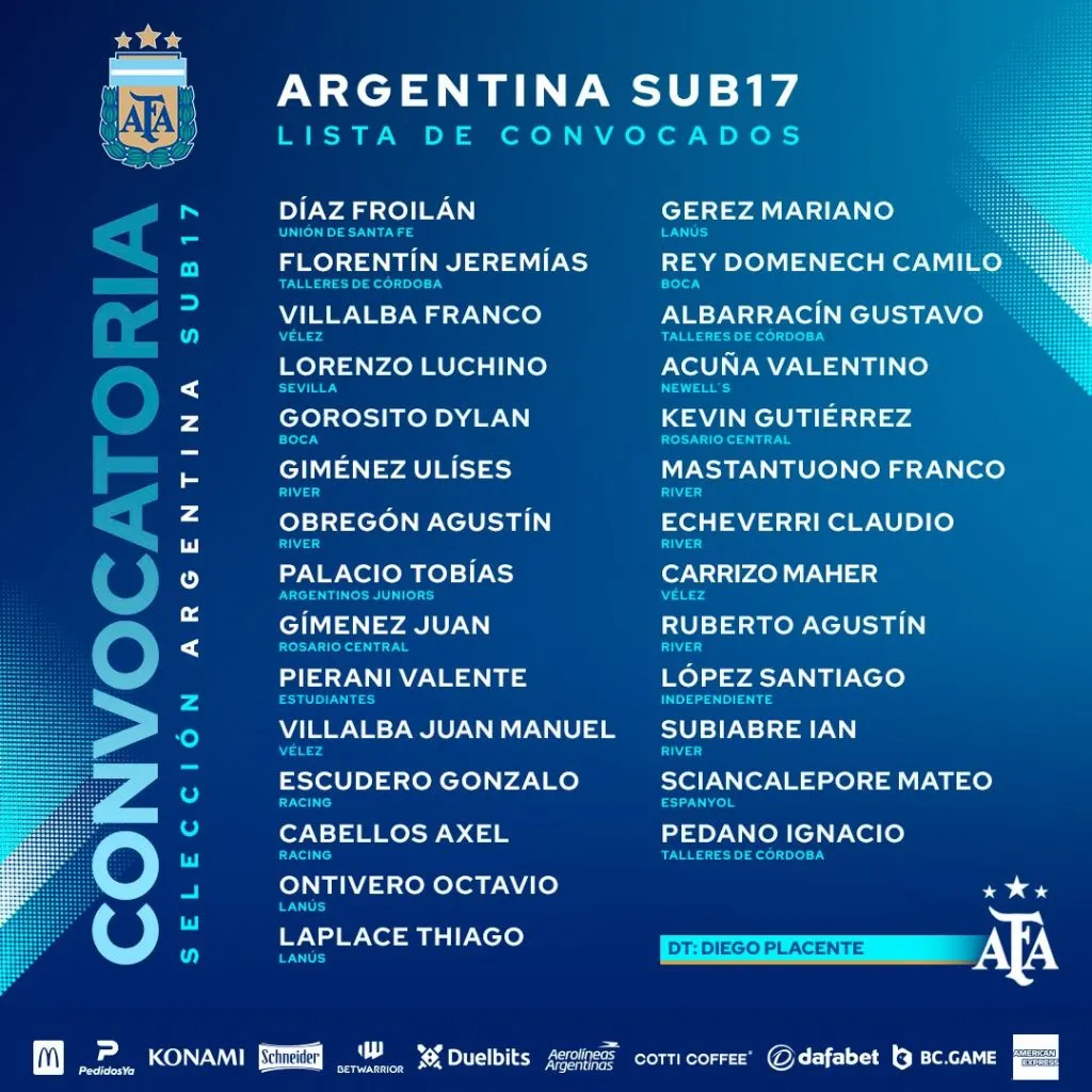 La ausencia del Diablito Echeverri también obedece a que fue convocado por la Selección Argentina. En su caso a la Sub 17, la cual se entrena en Ezeiza de cara a lo que será la cita máxima: el Mundial de la categoría que se desarrollará dentro de menos de un mes. Diego Placente citó a Echeverri, Giménez, Obregón, Mastantuono, Subiabre y Ruberto de River.