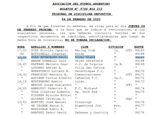 El boletín oficial del Tribunal de Disciplina de la AFA