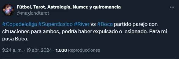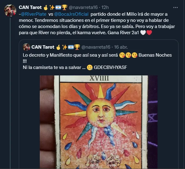 @Magiandtarot, otro reconocido tarotista de las redes sociales que suele lanzar sus pronósticos en todos los partidos del fútbol argentino, dijo que el superclásico “va a ser un partido parejo con situaciones para ambos, podría haber expulsado o lesionado. Para mi pasa Boca“.