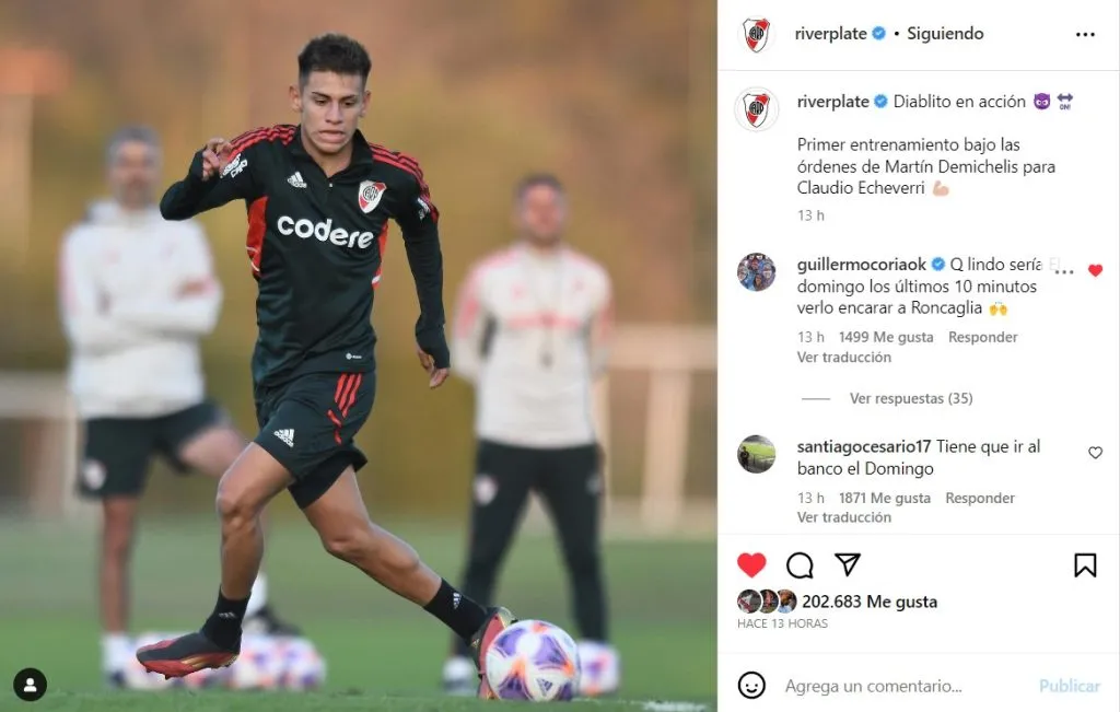 Claudio Echeverri está viviendo un gran momento. Fue la gran figura de la Selección Argentina en el Sudamericano Sub 17 disputado en Ecuador, su presente en la Reserva de River es muy bueno y Martín Demichelis lo tiene en la mira para lo que viene. Sin ir más lejos el pasado miércoles, el Diablito se entrenó con la Primera en la semana previa al superclásico.