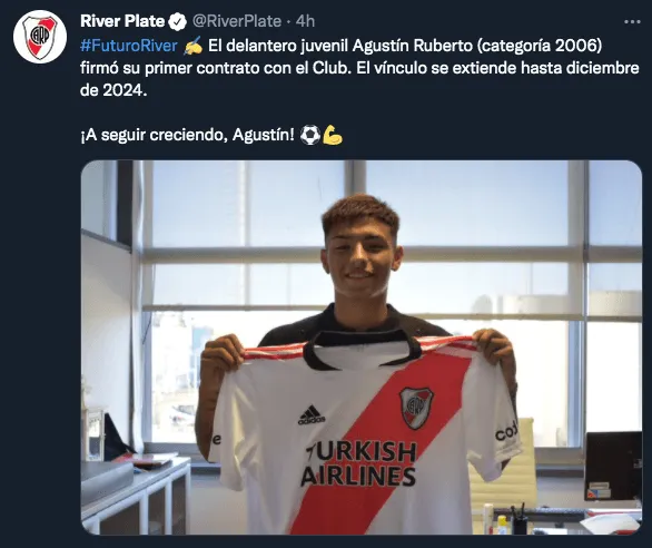 Según informó el Millonario a través de un comunicado en sus redes sociales durante los primeros días del 2022, Agustín Ruberto firmó un contrato hasta diciembre del 2024. Vínculo al que solo le queda una temporada por delante.