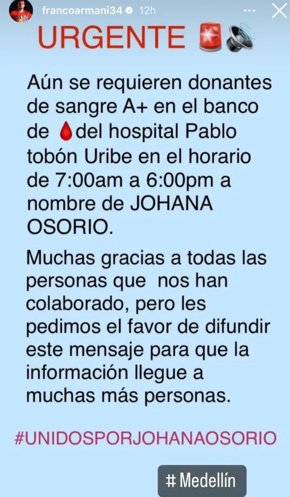 En este momento difícil de salud que atraviesa Johana, Franco Armani se sumó al apoyo por redes sociales y también difundió la imagen en la que se solicitan donadores de sangre de forma urgente para la mujer. ¡Fuerzas para toda la familia Quintero y Osorio!