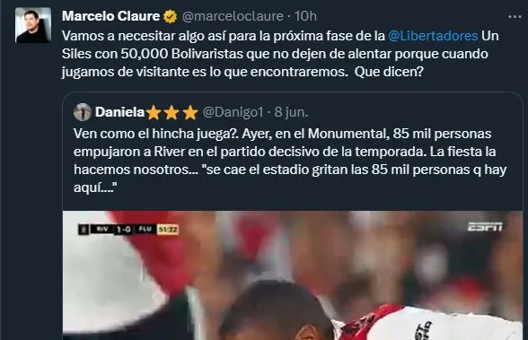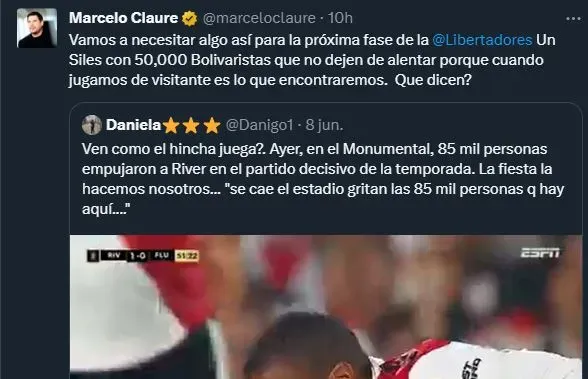 Marcelo Claure, presidente de Bolivar, puso como ejemplo lo que se vivió en Nuñez hace algunas horas y llamó a sus hinchas a que lo repliquen en la llave de octavos de final que se les avecina: “Vamos a necesitar algo así para la próxima fase de la Libertadores. Un Estadio Hernando Siles con 50,000 Bolivaristas que no dejen de alentar porque cuando jugamos de visitante es lo que encontraremos. Que dicen?“, twitteó.
