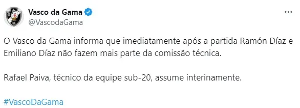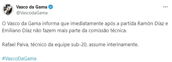 “Vasco da Gama informa que inmediatamente después del partido Ramón Díaz y Emiliano Díaz ya no forman parte del cuerpo técnico. Rafael Paiva, entrenador de la selección sub-20, asume de forma interina”, publicó el club brasileño en las redes sociales a la hora de anunciar la salida del riojano y su grupo de colaboradores.