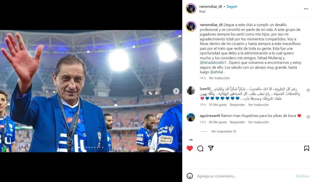 “Llegue a este club a cumplir un desafío profesional y se convirtió en parte de mi vida. A este grupo de jugadores siempre los sentí como mis hijos, por eso mi agradecimiento total por los momentos compartidos. Voy a llevar dentro de mi corazón y hasta siempre a este maravilloso país por el trato que recibí de toda su gente. Esta fue una oportunidad que debo a la administración a la cual quiero mucho y los considero mis amigos, Fahad Mufarrej y @fahadalotaibi1 . Espero que volvamos a encontrarnos y estoy seguro de ello. Los saludo con un abrazo muy grande, hasta luego Al-Hilal”, publicó en su cuenta de Instagram Ramón Ángel Díaz.