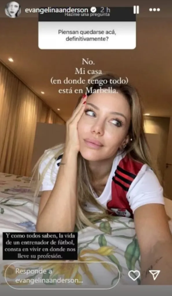 En Europa, de hecho, nacieron los tres hijos del DT con Evagelina Anderson (Bastián, Lola y Emma), y fue justamente la artista quien hace pocos meses atrás respondió a sus seguidores en redes sociales que le preguntaron si pensaban quedarse definitivamente en la Argentina, consulta frente a la cual contestó: “No. Mi casa, en donde tengo todo, está en Marbella”.