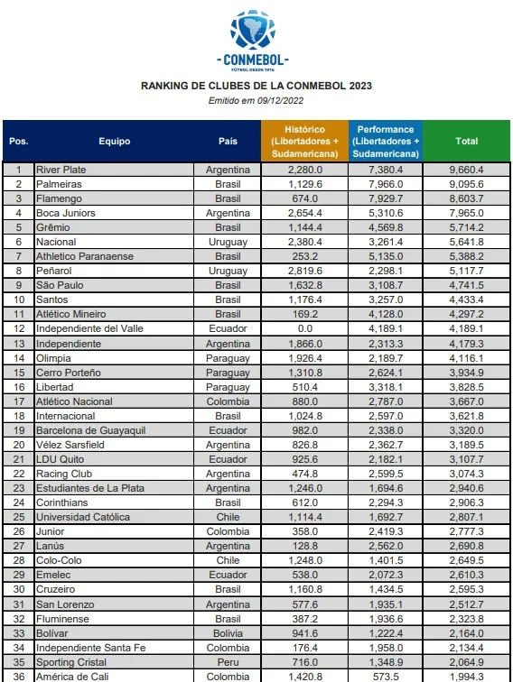 El Millonario es el líder del Ranking anual de la Conmebol actual con 9660,4 puntos, seguido de cerca por Palmeiras (9095,6) y Flamengo (8603,7), que ya están clasificados al Super Mundial de Clubes 2025 por haber ganado la Copa Libertadores. El cuarto en cuestión es Boca (7695), que no participará de la próxima edición.
