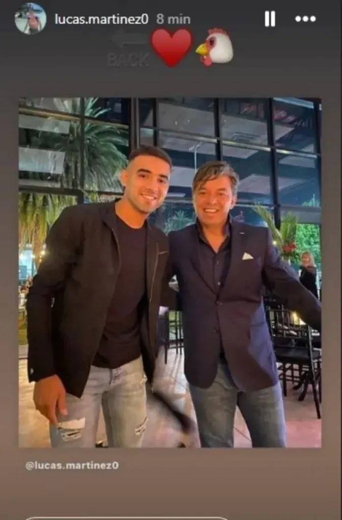 Lucas Martínez había subido dos historias: “Te están esperando en Alemania”, escribió en la primera junto a dos manos saludando, mientras que la segunda fue una foto con Marcelo Gallardo con el emoji Back, como pidiendo por su vuelta. Vale destacar que el Muñeco repatrió a HDM de Defensa y Justicia y fue con él cuando alcanzó su mejor en River, en 2021.