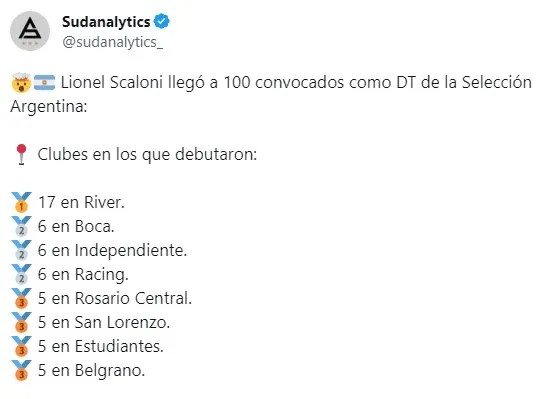 A la hora de establecer un desglose del club en el que debutó cada uno de los cien convocados, el dominio de River en esta Selección Argentina es absoluto: cuenta con 17 jugadores, seguido desde muy atrás por Boca, Independiente y Racing con 6; más atrás vienen Rosario Central, San Lorenzo, Estudiantes y Belgrano con 5, según publicó la cuenta de Twitter @Sudanalytics. Datos que ubican al Millonario como el verdadero semillero de los campeones del mundo.