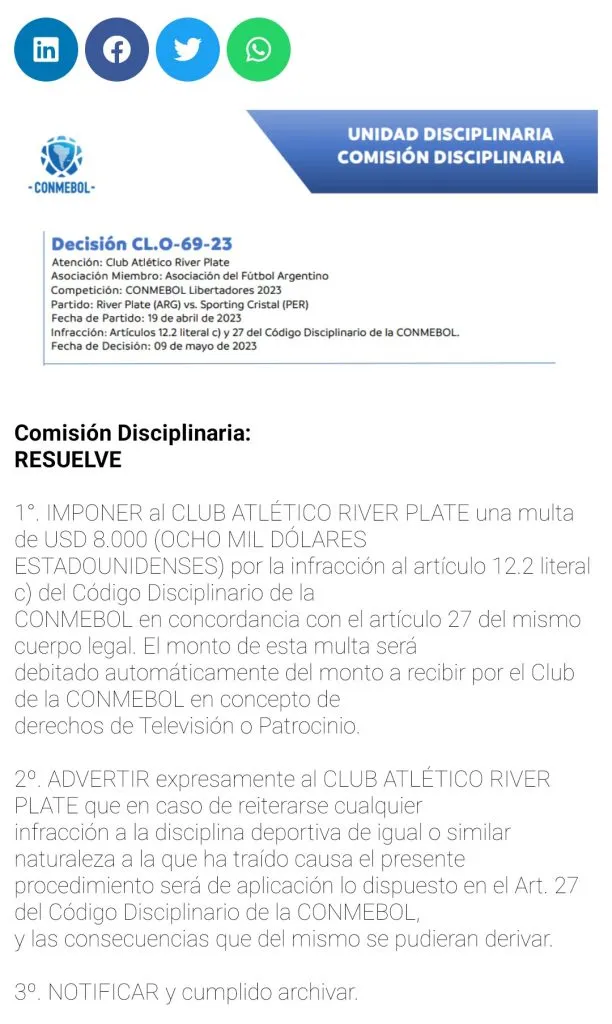 La Comisión Disciplinaria decidió imponerle a River un multa económica de 8 mil dólares. La misma se debitará automáticamente de los ingresos que recibirá el Millonario por derechos de televisación o patrocinio. Además, advirtió que en caso de reiterar una infracción de similar naturaleza, podría recibir una suspensión parcial del Estadio Monumental. El Más Grande no apelará la medida.