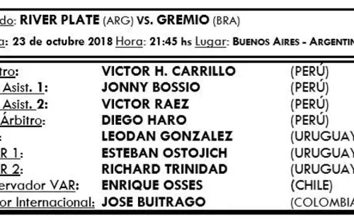 La Confederación Sudamericana de Fútbol también anunción quiénes serán los árbitros encargados de impartir justicia en el estadio Antonio Vespucio Liberti. El juez principal será el árbitro Víctor Carrillo. Jonny Bossio, Víctor Raez y Diego Haro serán los asistentes serán sus asistentes. ¿El VAR? Estará a cargo de los uruguayos Leodan González, Esteban Ostojich y Richard Trinidad, y del chileno Enrique Osses.