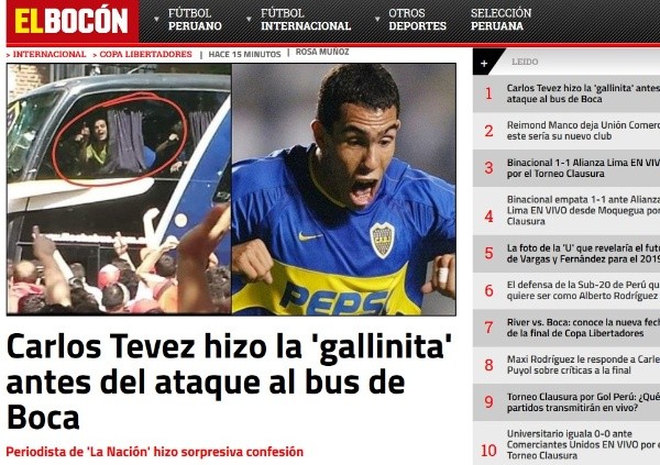 ¿Qué pasó? En diálogo con El Bocón de Perú, fueron compartidas las palabras del periodista Carlos Raymundo Roberts (de La Nación). “Por Dios, qué locura. Todavía me estallan los ojos por lo que vi y el cuerpo por lo que padecí en medio de apretujones, corridas, tumultos, caídas. Y una y otra vez me vuelve la imagen de Tevez haciendo la gallinita con sus brazos desde arriba del ómnibus que llevaba al plantel de Boca al Monumental. Veterano de mil batallas, jugador de dos mundiales, campeón en cuatro países, ese Tevez reducido en su burla a ave de corral parecía el perfecto colofón a una tarde de horror”, manifestó Raymundo.
