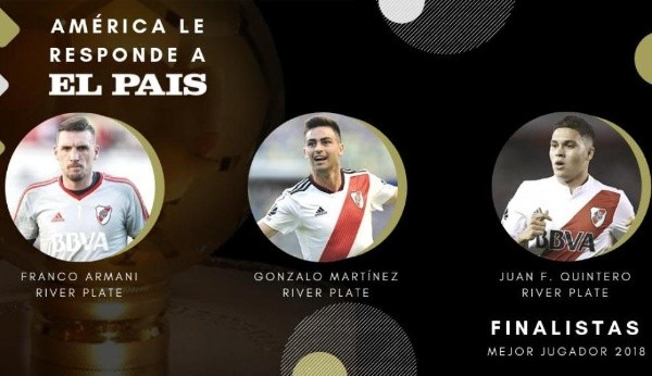 ¿Quiénes son? Gonzalo Martínez, Juan Fernando Quintero y Franco Armani. En una terna que tiene tan sólo un precedente y también es del Millonario, Diario El País (de Uruguay) nominó a tres jugadores del mismo club (River) y de acá saldrá el ganador de un premio que es considerado el galardón oficial dentro de nuestro continente y que consagra al “Rey de América” -así llaman a quien resulta primero-.
