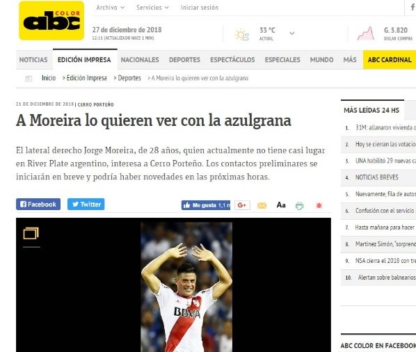 El lateral derecho del Millo estaría tras los pasos de Cerro Porteño. Así lo dio a conocer el reconocido paraguayo ABC. Clavito, quien tiene contrato con el club hasta el 30 de junio de 2020, está buscando continuidad ya que ha disputado apenas 8 partidos oficiales en 2018.