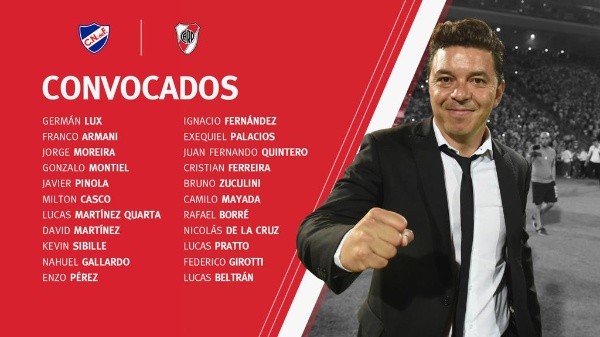 Esta tarde, MarceloGallardo presentó la lista de convocados para dicho encuentro. ¿Las novedades? JonatanMaidana, LeonardoPonzioe Ignacio Scocco no figuran en la nómina. El defensor se irá a Toluca en las próximas horas, al volante decidió darle descanso para no forzarlo y lo del delantero es por obvias razones: padece una lesión muscular.