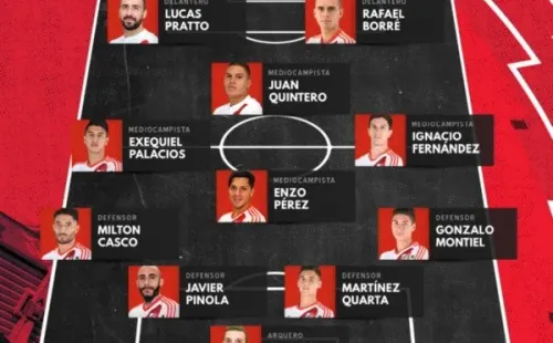 ¿Cómo formaría La Banda en el Monumental? ConFranco Armani; Gonzalo Montiel, Lucas Martínez Quarta, Javier Pinola, Milton Casco; Nacho Fernández, Enzo Pérez, Ezequiel Palacios; Juanfer Quintero; Rafael Santos Borré y Lucas Pratto.