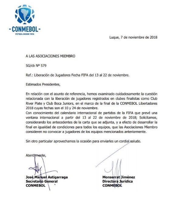 En un comienzo, AFA emitió un comunicado en el que reconoció públicamente su pedido a Conmebol para que ninguna selección sudamericana (al igual que la albiceleste) convoque a jugadores del Millo y el eterno rival en la fecha FIFA que se extiende desde el 12 al 20 de noviembre.