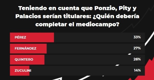 La Página Millonaria le consultó al hincha quién debe ser el cuarto volante que debe ser titular en la finalísima contra el eterno rival. La mayoría de los hinchas eligió a Enzo Pérez (33%), quien en la ida ha mostrado personalidad y ha protagonizado un buen papel, mientras que de atrás corren Ignacio Fernández (27%), Juan Fernando Quintero (26%) y Bruno Zuculini(14%)