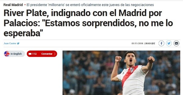 “Hasta ahora creíamos que era todo falso, pero no. Lo hemos confirmado por parte del propio representante y desde River nos sorprende, si es como parece, que una institución señorial como el Madrid haya actuado en esta negociación directamente con el futbolista, sin respetar a un club como River y a sus espaldas“, manifestó el Presidente del club de Núñez en claro descontento con quien asesora a Palacios.