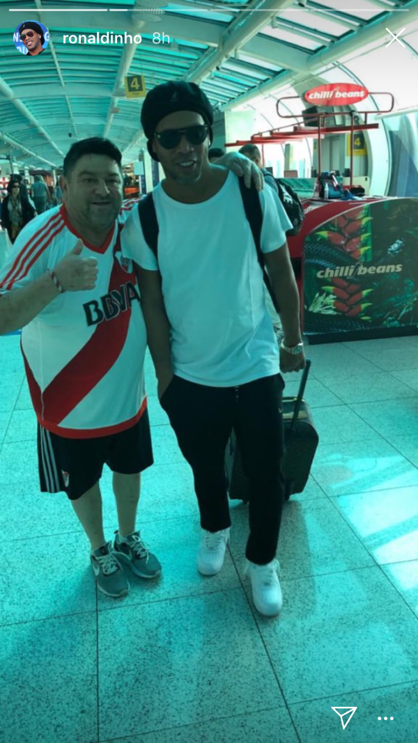 Hoy por la tarde, el crack viajó hacia Gama (Brasil) a disputar un partido de leyendas entre Flamengo y Fluminense. Y la novedad fue la curiosa foto que Ronaldinho subió junto a un hincha de River, que posó con el manto sagrado en un aeropuerto. ¿Se habrá acordado de la vez que se enfrentó al Más Grande?