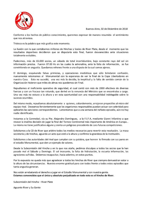 Por otra parte, la Subcomisión del Hincha disparó contra las máximas autoridades de la Conmebol y de la FIFA:“Instamos a Conmebol, Alejandro Domínguez, FIFA y Gianni Infantino que revean la insólita decisión de jugar la final del torneo continental más importante de América en Europa. Solicitamos a las autoridades del rival que cumplan con su palabra, que honren lo firmado con sus pares en el estadio Monumental, que den un ejemplo de valores”.