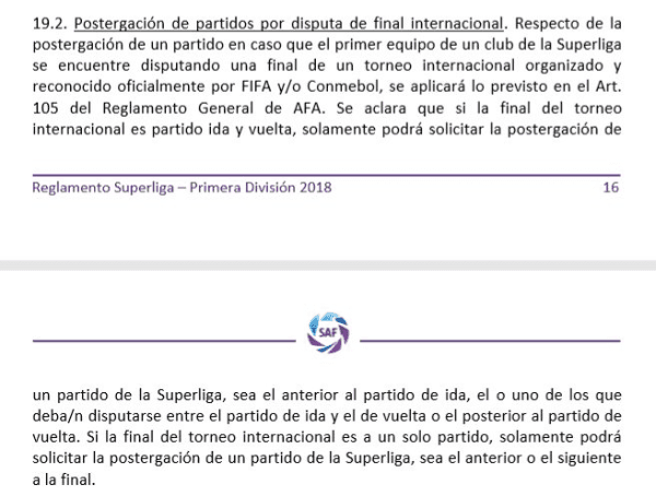 El reglamento de Superliga es claro: sólo permite postergar un partido en caso de que el equipo en cuestión dispute una final bajo el plano internacional. Ante esta situación, Gimnasia de La Plata no podrá correr el encuentro ante River de este domingo 2 de diciembre a las 21:30 horas (en el estadio Monumental).