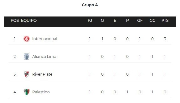 Por el momento, El Más Grande comparte el segundo puesto con Alianza Lima (ambos tienen una unidad).Quien es líder del Grupo A es Inter de Brasil, que en la ida venció -justamente- a Palestino.