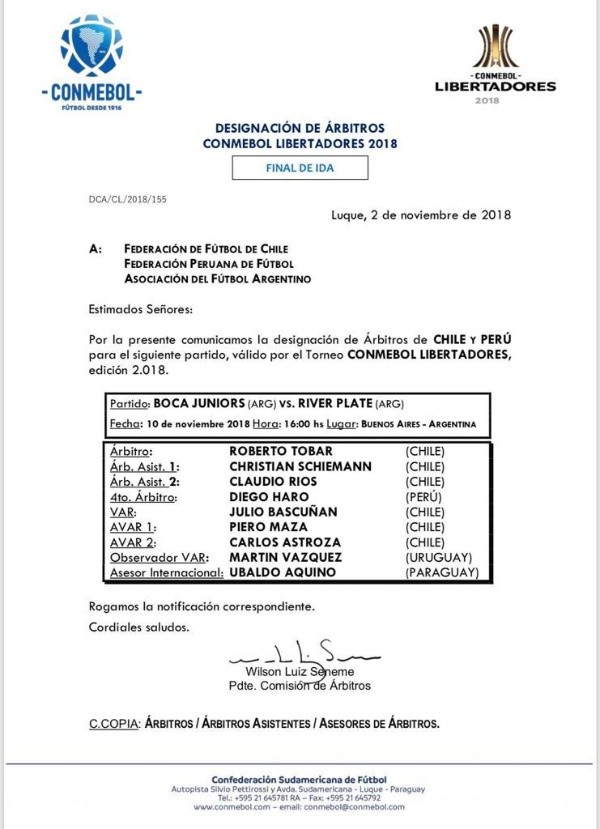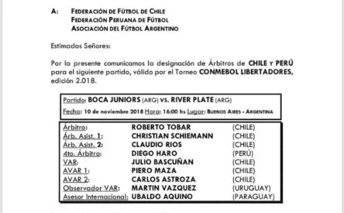 La primera final entre River y Boca se jugará el próximo sábado 10 de noviembre en La Bombonera. La Copa Libertadores 2018 comenzará a definirse en el estadio del eterno rival, desde las 16 horas, y para este encuentro ya hay árbitro designado por Conmebol.