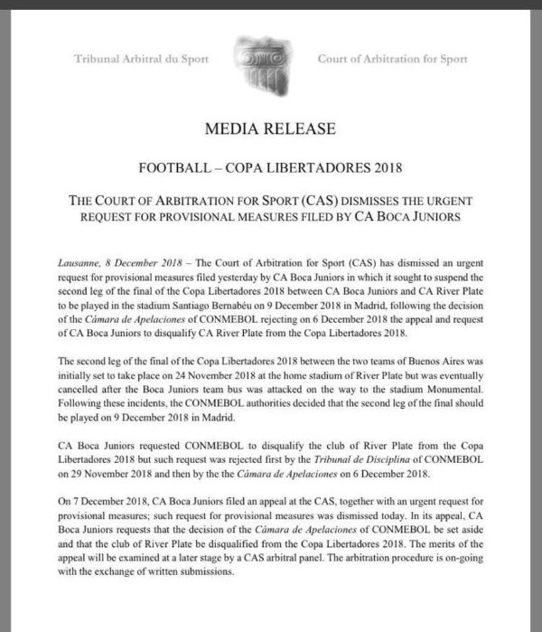 Este sábado, el Tribunal Arbitral del Deporte (TAS) emitió un comunicado en donde rechazaba un pedido urgente de Boca. Uno más, paralelo al iniciado por las agresiones al micro. ¿Qué buscaba este petitorio? Suspender el partido en Madrid y ser coronados campeones en una oficina.