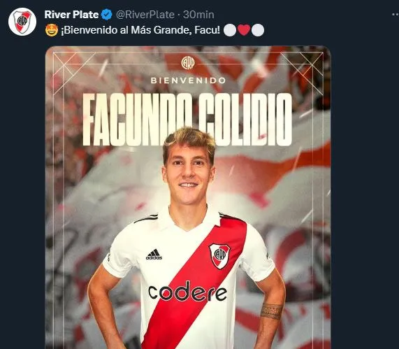 “Bienvenido al Más Grande, Facu”, fue la frase que usó River para presentar a Colidio, slogan que no había sido utilizado en la presentación de Funes Mori y que sacaron a relucir para una presentación muy esperada. Colidio eligió la vereda correcta y se celebra.