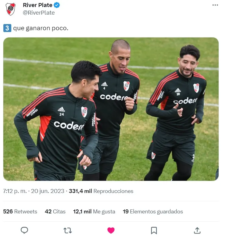 El club compartió una foto de ellos tres entrenando en el River Camp y con un tinte irónico acompañaron la imagen con un texto que decía: “3 que ganaron poco”. Los hinchas reventaron la publicación con Me Gusta y en los comentarios elogiaron al CM de River y lógicamente también a los tres referentes del plantel que son sumamente queridos por todos los fanáticos del Millonario.