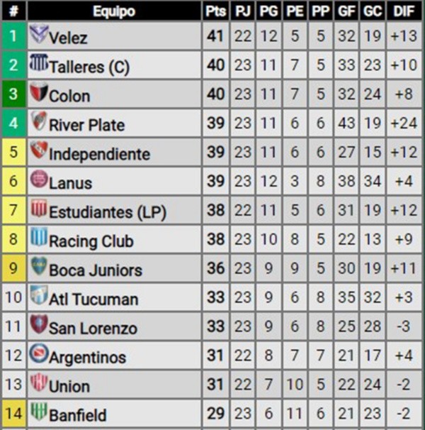 Colón ya está clasificado a la Libertadores 2022 por ser campeón de la Copa de la Liga 2021. Los tres primeros de esta tabla también irán a la Libertadores y los cuatrosiguientes tendrán su lugar en la Copa Sudamericana, además de Boca y Banfield, ya clasificados.