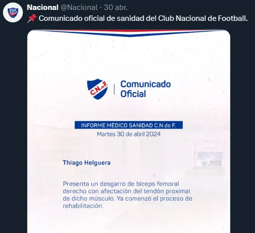 Hace algunos días, Nacional informó el parte médico de Thiago Helguera, joven volante de 18 años que fue titular ante Deportivo Táchira en la última fecha y que tuvo que salir reemplazado a los 27 minutos: tiene un desgarro en el bíceps femoral derecho y deberá estar 21 días sin jugar, por lo que quedó descartado para el duelo frente al Más Grande.