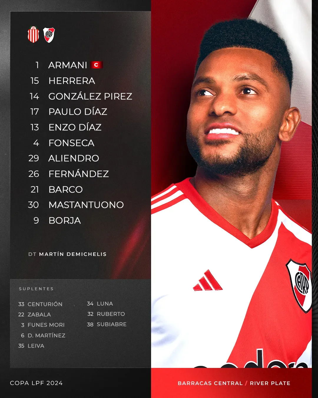 Los once del Millonario: Armani; Herrera, González Pirez, Paulo Díaz, Enzo Díaz; Aliendro, Fonseca; Nacho Fernández, Mastantuono, Barco; Borja.