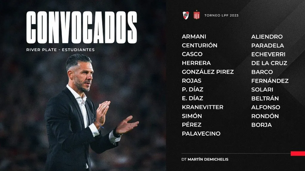 Luego de la práctica matutina en Núñez, el cuerpo técnico del Más Grande dio a conocer la lista de convocados para el encuentro de este sábado frente al Pincha. El entrenador millonario decidió convocar a los mismos protagonistas que vienen de igualar frente a San Lorenzo en la última jornada. Quedarán todos concentrados en el primer piso del Monumental, desde donde seguirán las acciones del partido entre Huracán y Talleres para ver si hay celebración adelantada.