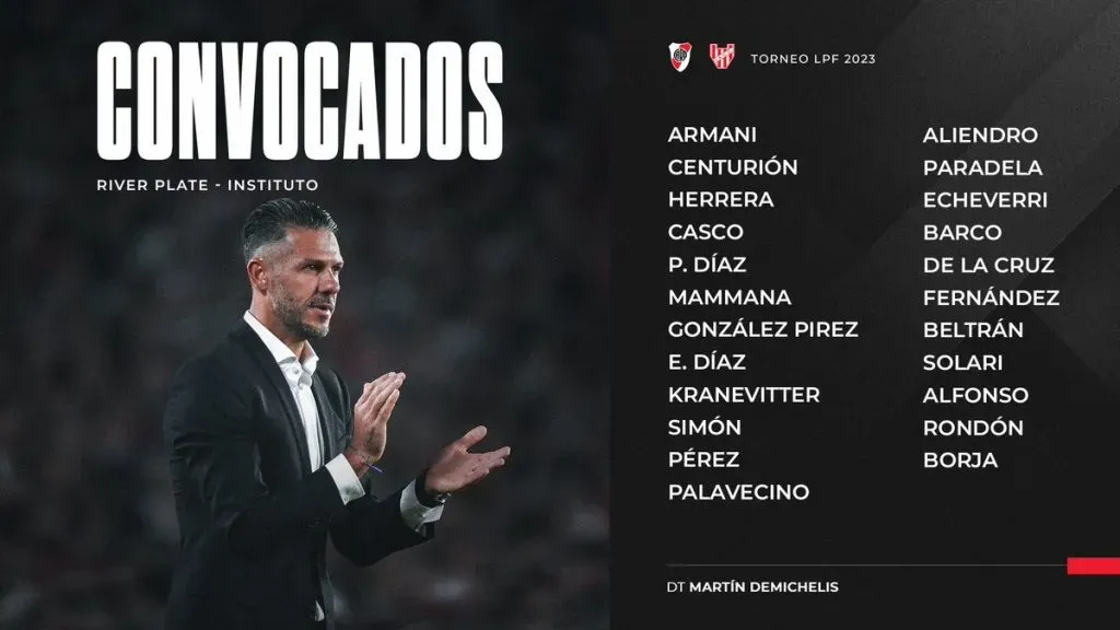 Luego de la práctica en Núñez y antes de quedar concentrados en el Estadio Monumental, el cuerpo técnico definió la nómina de convocados y hubo varias sorpresas. Además de la ausencia de Matías Suárez, el que quedó fuera de la lista fue Robert Rojas. El paraguayo regresó de la fecha FIFA sin inconvenientes físicos y entrenó a la par del grupo, pero entró en una rotación de laterales y este encuentro ante Instituto lo mirará desde afuera. Lo mismo sucederá con Jonatan Maidana y Elías Gómez, los otros que quedaron al margen de los citados.