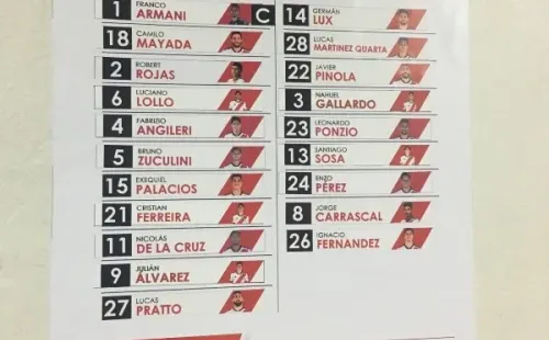 ¿Los once elegidos? 1-Franco Armani; 18-Camilo Mayada, 2-Robert Rojas, 6-Luciano Lollo, 4-Fabrizio Angileri; 11-Nicolás De La Cruz, 5-Bruno Zuculini, 15-Exequiel Palacios; 21-Cristian Ferreira; 9-Julián Álvarez y 27-Lucas Pratto.